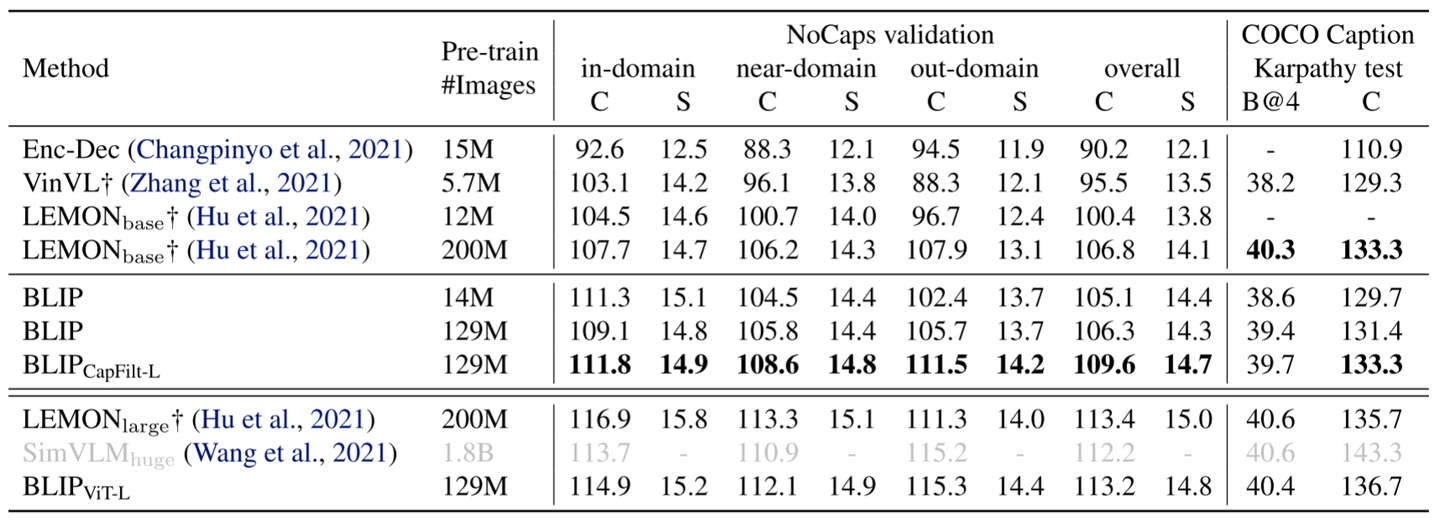 BLIP在 COCO 和 NoCaps 数据集上比较图片字幕任务实验结果,两者都使用在 COCO 上微调的模型和 LM 损失进行评估。遵循 SimVLM 的做法在每个字幕的开头添加了一个提示 “a picture of”,得到的结果更好了。使用了 14M 预训练图像的 BLIP 大大优于使用相似数量预训练数据的方法。使用了 129M 图像的 BLIP 实现了与使用了 200M 的 LEMON 相比具有竞争力的性能。