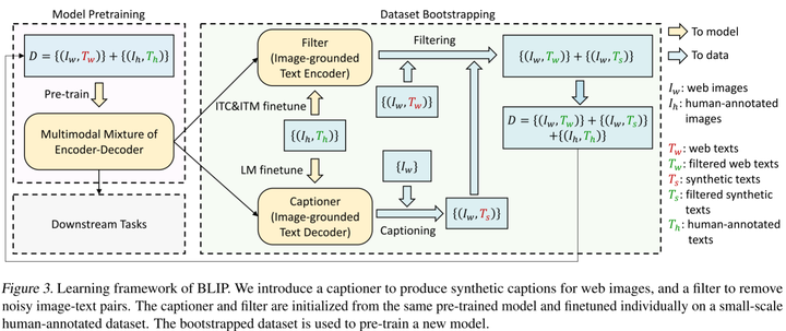 BLIP的学习框架。我们引入了一个字幕器来为网页图像生成合成字幕,并引入了一个过滤器来去除图像-文本对中的噪声。字幕和过滤器从相同的预训练模型初始化,并在小规模人类注释数据集上单独微调。引导数据集用于预训练新模型。