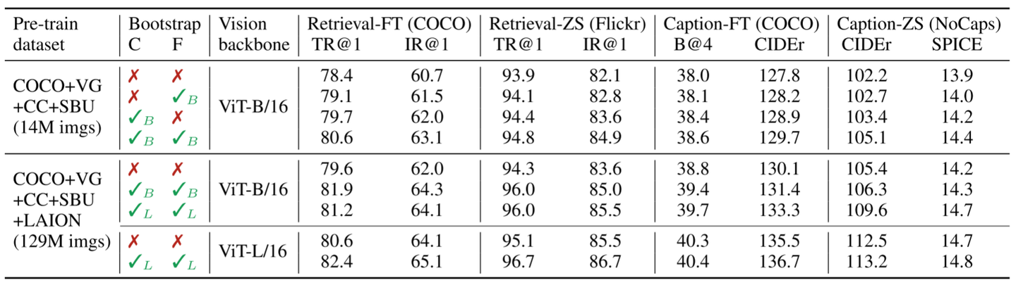 当使用更大的数据集 129M 的设置或者更大的模型 ViT-L 时,CapFilt 可以进一步提高性能,这验证了它在数据大小和模型大小方面的可扩展性。而且,仅仅增加字幕器和过滤器的模型尺寸时,也可以提高性能。