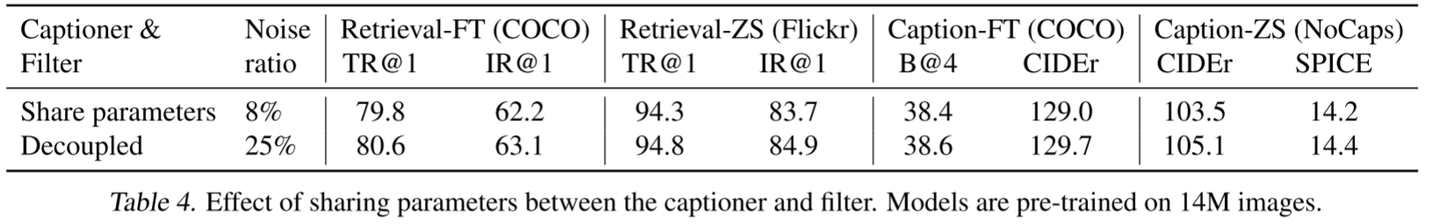 研究了字幕和过滤器以与预训练相同的方式共享参数的效果。下游任务的绩效下降,我们主要归因于确认偏差。由于参数共享,由字幕器产生的噪声字幕不太可能被过滤掉,如较低的噪声比(8%与25%相比)所指示的。