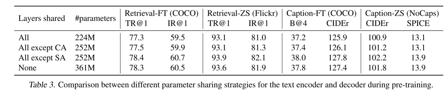 评估了使用不同参数共享策略预训练的模型,其中预训练是在14M图像和Web文本上执行的。结果表明,与不共享相比,共享除SA之外的所有层会导致更好的性能,同时还减小了模型大小,从而提高了训练效率。如果SA层是共享的,则由于编码任务和解码任务之间的冲突,模型的性能会降低。在CapFilt期间,字幕器和过滤器在COCO上单独进行端到端的微调。