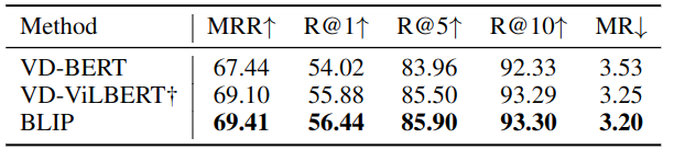 视觉对话任务在自然会话设置中扩展了 VQA,其中模型不仅需要基于图像-问题对预测答案,还需要考虑对话历史和图像的字幕。BLIP对预训练模型进行了修改,在 VisDial v1.0 验证集上实现了最先进的性能。