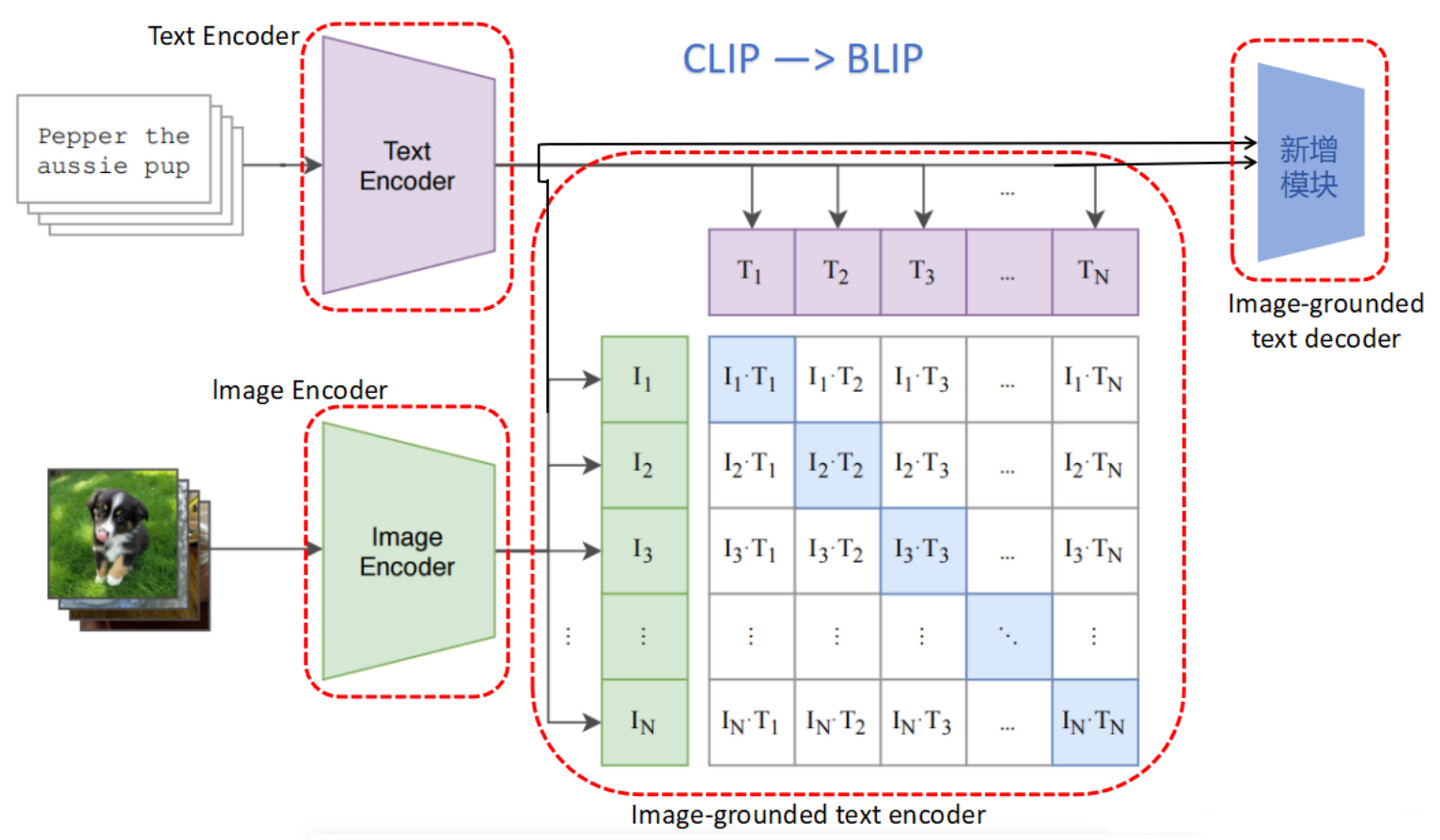 BLIP提出了一种统一的预训练框架,同时支持图像-文本匹配、图像-文本检索、图像描述生成和视觉问答(VQA)等多种任务。这种设计避免了传统方法中需要为不同任务设计不同模型的局限性。
