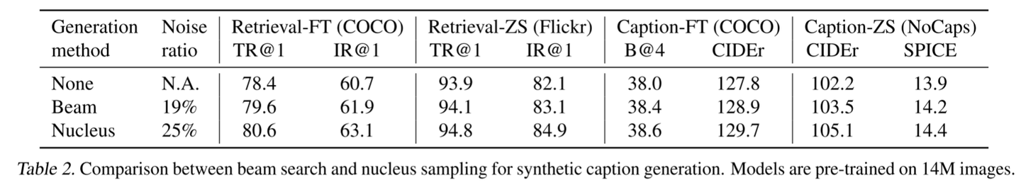 合成字幕生成的束搜索和核采样之间的比较。模型在14M图像上进行了预训练。