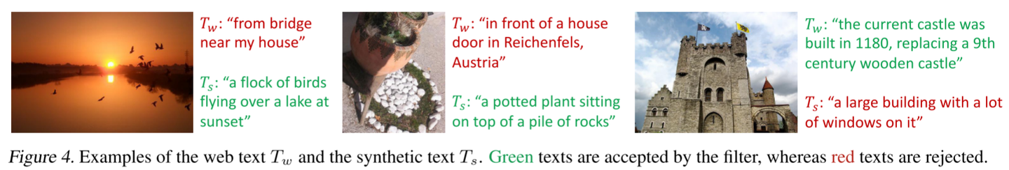 将过滤后的 Web 数据 和合成的描述文本数据 加入到原始数据集中,进一步增强数据量和质量。