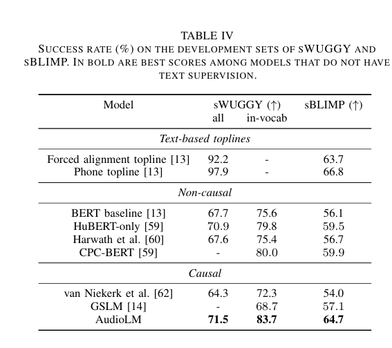 如表4(TABLE IV):在没有文本监督的模型中,AudioLM在sWUGGY的两个分割中都实现了最高的分数。同样,它还在sBLIMP指标中获得了最高分,相对于之前的最佳(CPC-BERT [59])提高了8%。AudioLM甚至超过了使用强制对齐音素转录的监督基线。