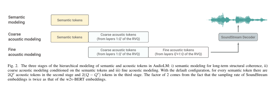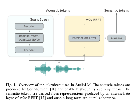 从原始音频波形开始,本论文首先从一个使用自监督掩蔽语言建模目标预训练的模型中构建粗略语义标记。这些标记的自回归建模捕捉了局部依赖关系(例如,语音中的音素、钢琴音乐中的局部旋律)和全局长期结构(例如,语音中的语言语法和语义内容;钢琴音乐中的和声和节奏)。然而,这些标记导致重建质量较差。为了克服这一限制,除了语义标记外,我们还依赖由SoundStream神经编解码器产生的细粒度声学标记,这些标记捕捉了音频波形的细节,允许高质量合成。训练一个语言模型来生成语义和声学标记,同时实现高质量音频和长期一致性。