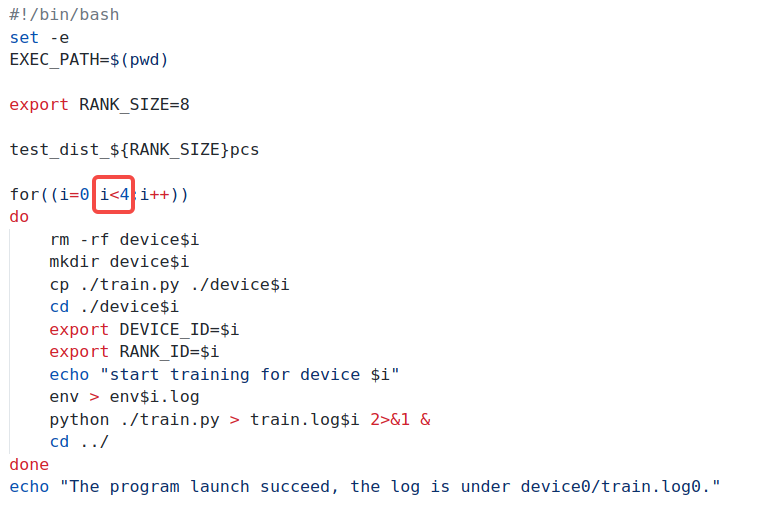 查看下启动脚本,发现里面只运行了4个进程,但是我们配置的rank_table却是8卡的。因此,只有03卡启动了程序,48卡并没有进程在启动。卡0无法连接卡4,因此造成上述的报错,解决方法:将bash启动脚本中的4改成8,如下所示: