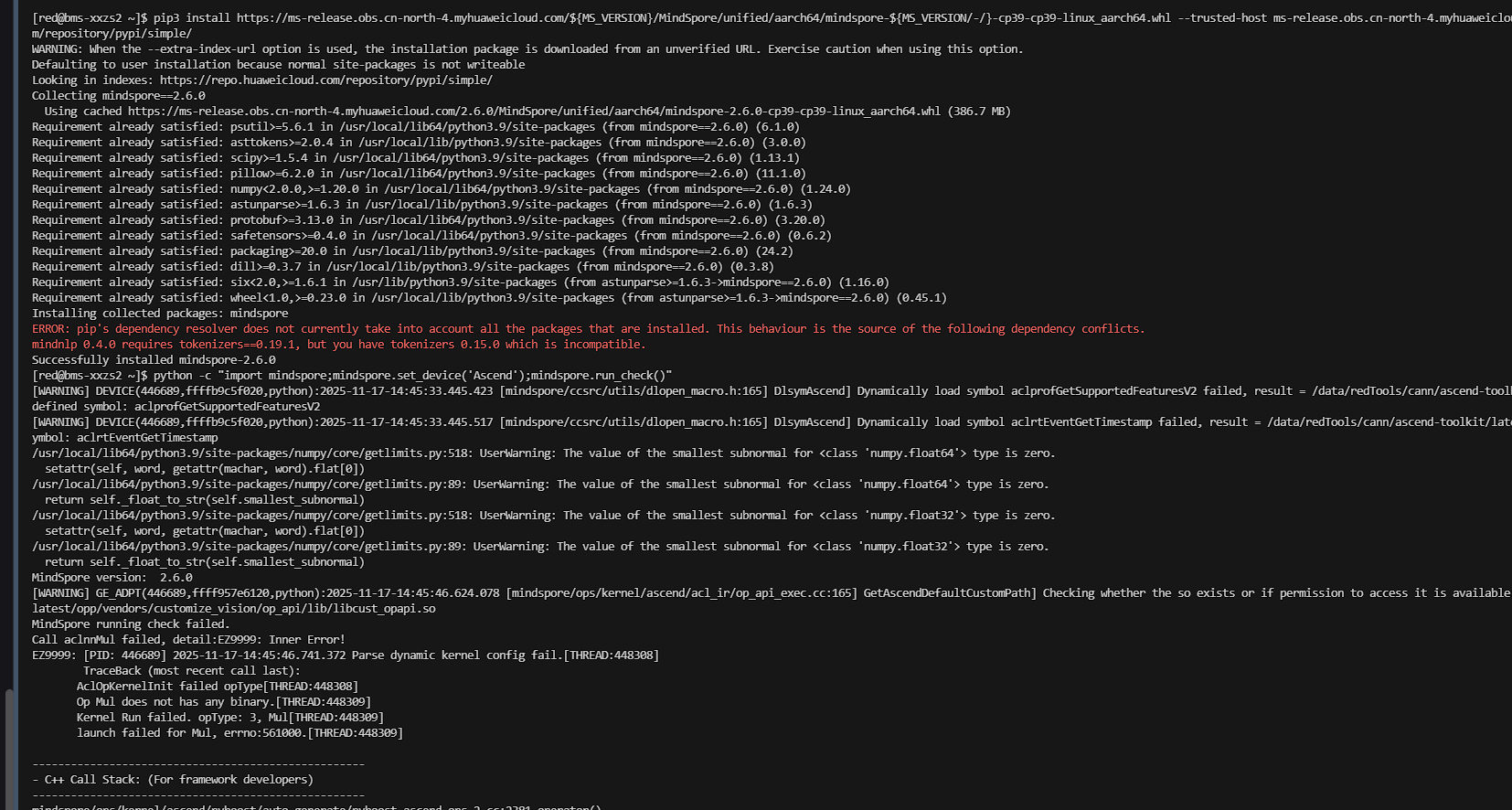 参考MindSpore安装 | 昇思MindSpore社区安装2.6.0的mindspore运行python -c "import mindspore;mindspore.set_device(‘Ascend’);mindspore.run_check()"报错,请问是什么情况造成的