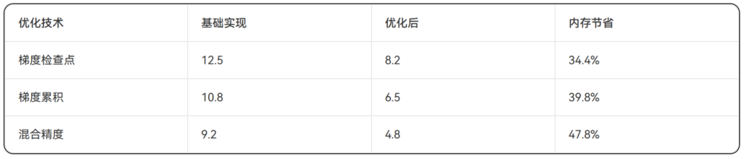 3、内存效率:梯度检查点和累积技术可减少40%以上的内存占用。