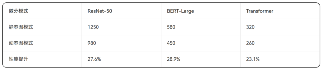 表1:自动微分模式性能对比(训练速度:samples/sec)