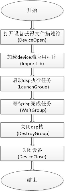 异构编程接口(Hthreads)由通用区域侧(如arm端)API和加速区域侧(如dsp端端)API组成,通过用户程序,通用区域中的arm核能够管理任务执行、运行操作系统以及处理通用任务,而加速区负责密集型计算任务。图1.1展示了Hthread控制加速区处理计算任务的主要流程。