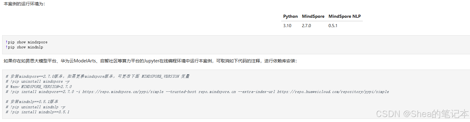 输出显示是旧版本。查看案例要求,明确指出需要 MindSpore 2.7.0 和 MindNLP 0.5.1。