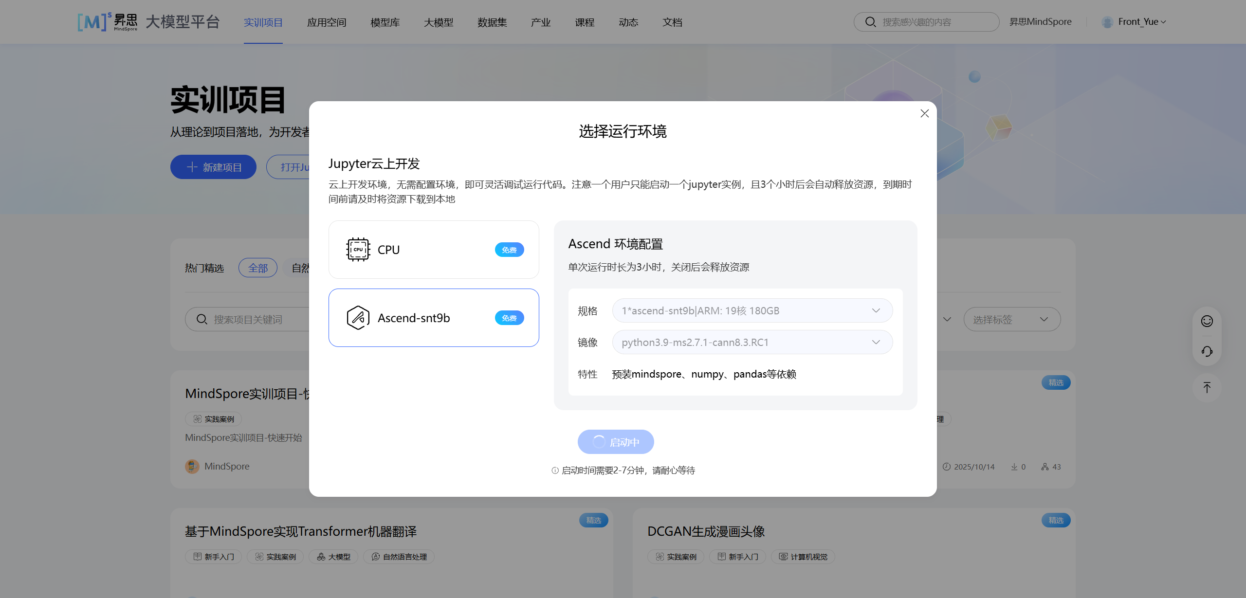 点击“打开 Jupyter 在线编程”后,选择合适的运行环境。本案例推荐使用 Ascend-snt9b 环境,镜像选择包含 mindspore 的版本(如 python3.9-ms2.7.1-cann8.3.RC1)。