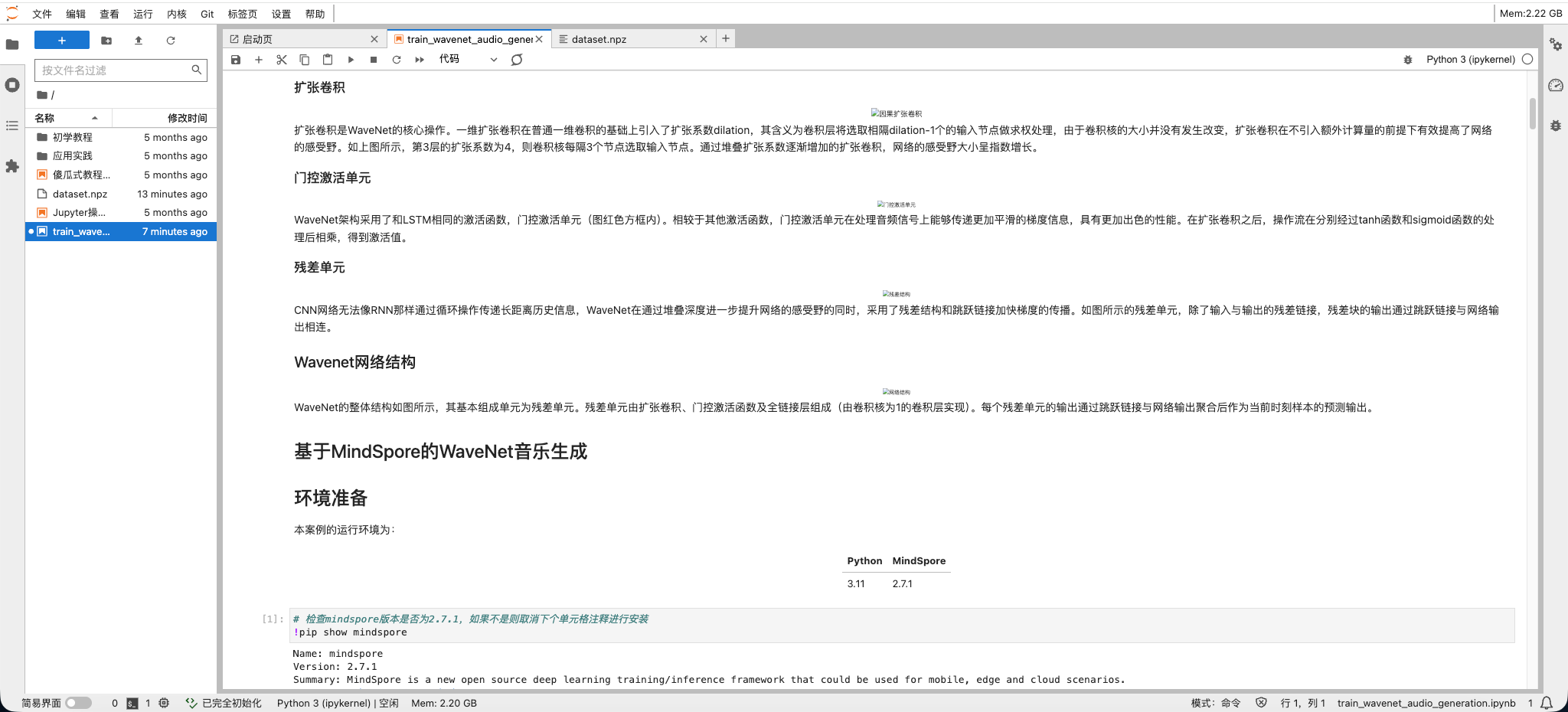 WaveNet 是一种典型的自回归生成模型,能够直接对原始波形建模。相比“先提特征再生成”的路线,WaveNet 直接在采样点级别学习概率分布,因此在音频生成/语音合成中能获得更自然的效果。本实践基于 MindSpore复现一个简化版 WaveNet,用少量音频数据训练后,生成一段新的音乐/音频片段。