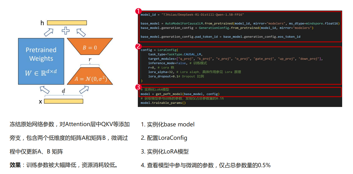 该旁路由两个可训练的低维矩阵 A 和 B 组成,替代对原始大矩阵的直接更新。微调过程中仅更新 A 和 B,从而显著减少训练参数量,降低计算与内存开销,同时保持接近全参数微调的性能表现。